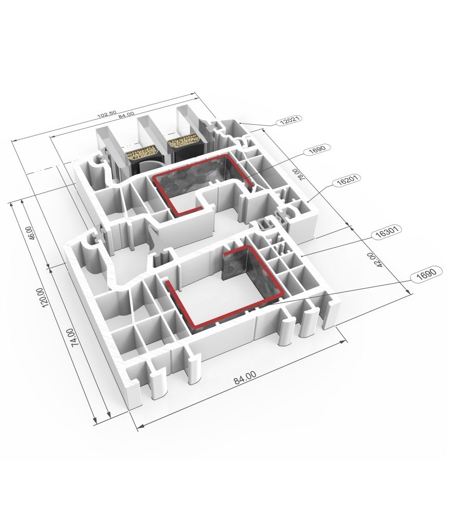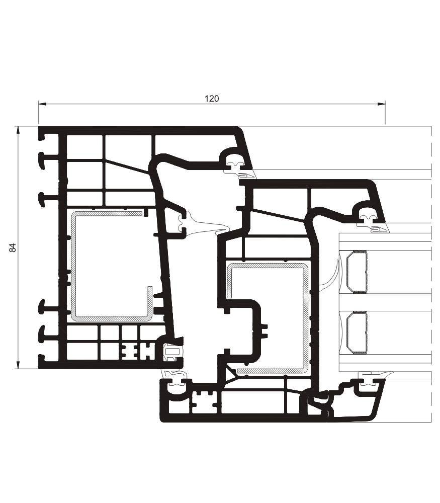 Sistema abisagrado de 70 mm de profundidad de marco compatible con cualquier herraje de canal 16 estándar. Presenta una rotura de puente térmico de 35 mm en marco y 30 mm en hoja, ofreciendo un gran rendimiento térmico y acústico.