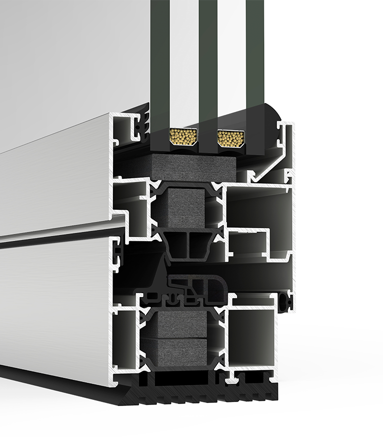 Sistema abisagrado de 70 mm de profundidad de marco compatible con cualquier herraje de canal 16 estándar. Presenta una rotura de puente térmico de 35 mm en marco y 30 mm en hoja, ofreciendo un gran rendimiento térmico y acústico.